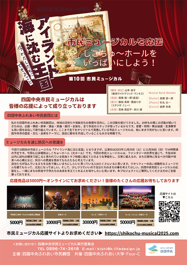 四国中央市土居町入野56番地ちかいビル4階 四国中央市民ミュージカル実行委員会 TEL:0896-74-3618 FAX:0896-22-3218 E-mail:musical@r-lifedesign.jp TEL:090-2784-3555(担当:岸) |