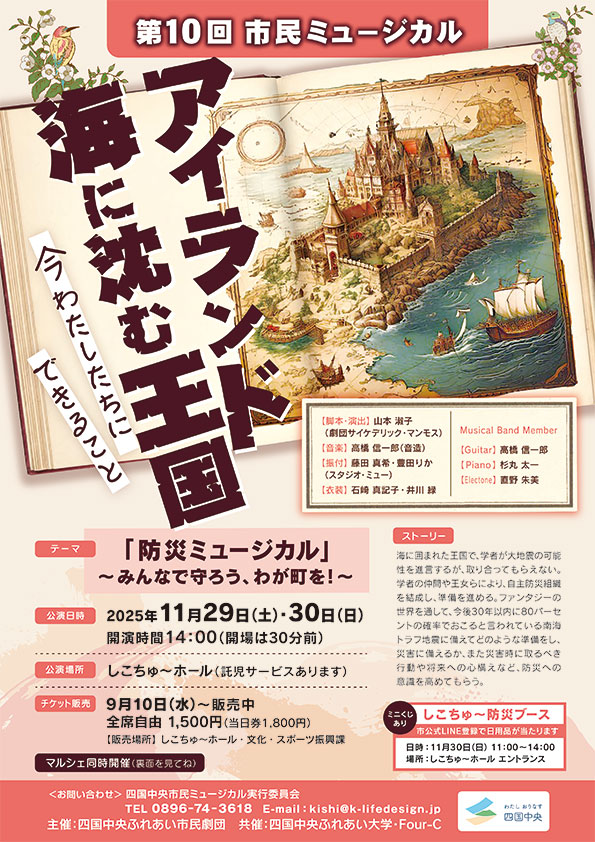 四国中央市土居町入野56番地ちかいビル4階 四国中央市民ミュージカル実行委員会 TEL:0896-74-3618 FAX:0896-22-3218 E-mail:musical@r-lifedesign.jp TEL:090-2784-3555(担当:岸) |